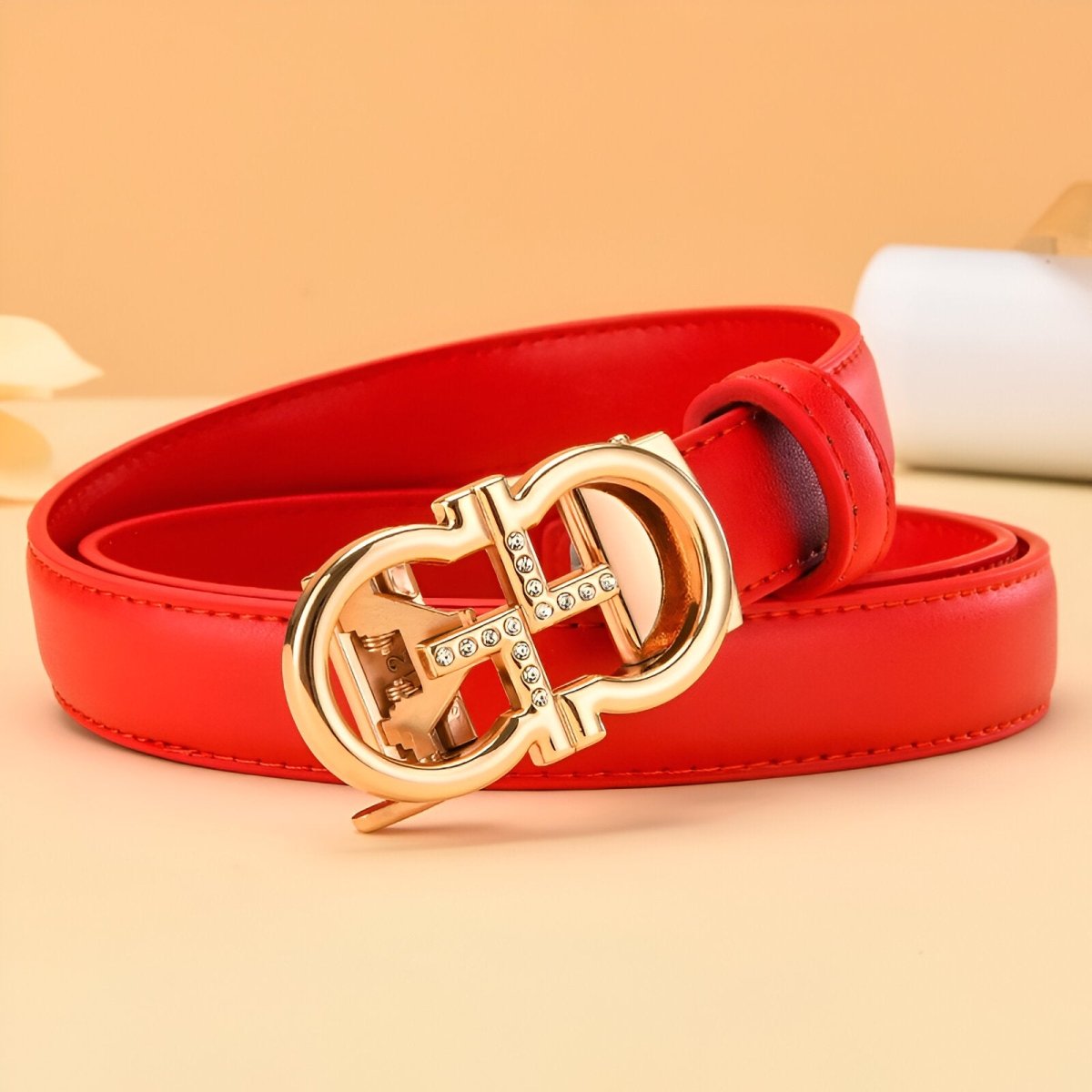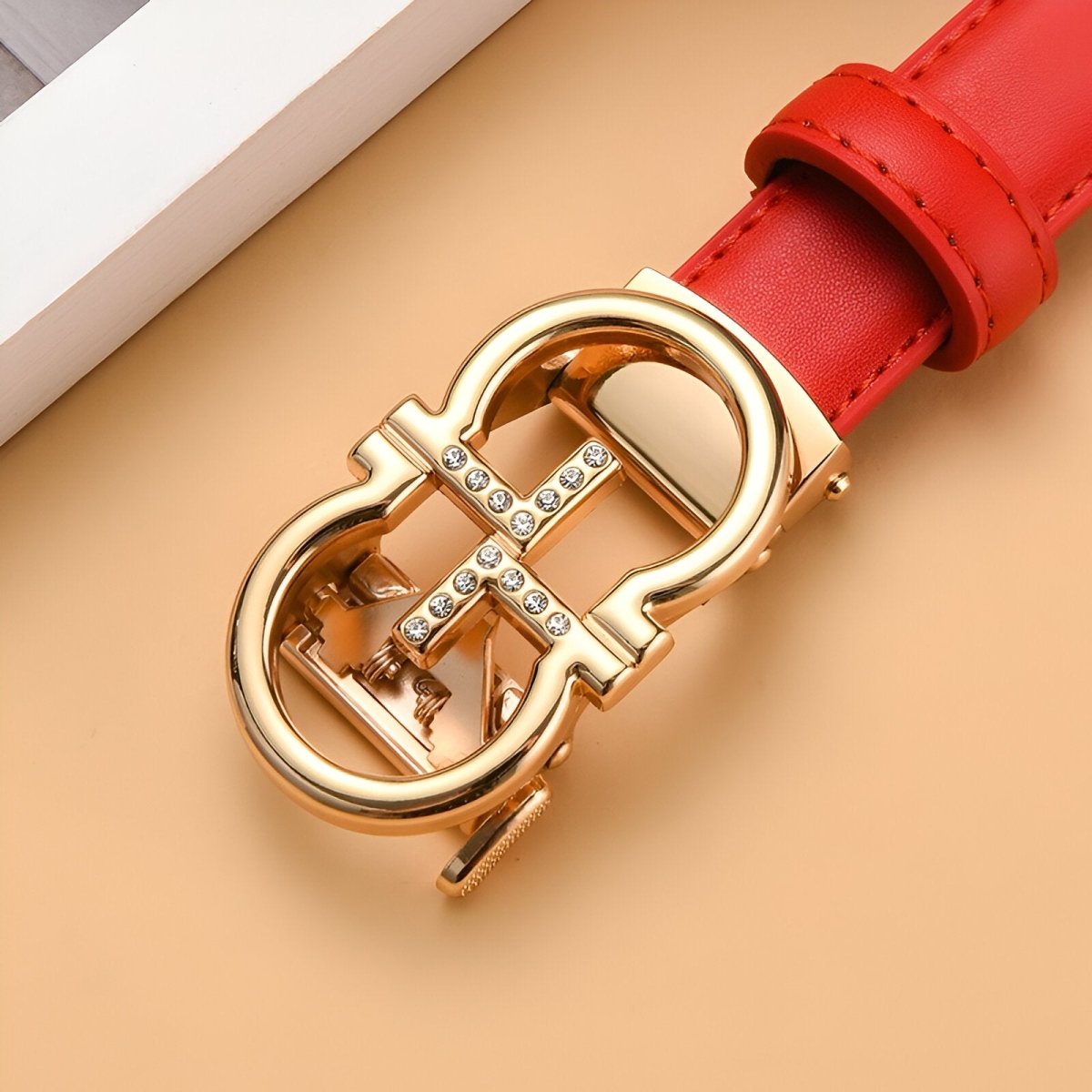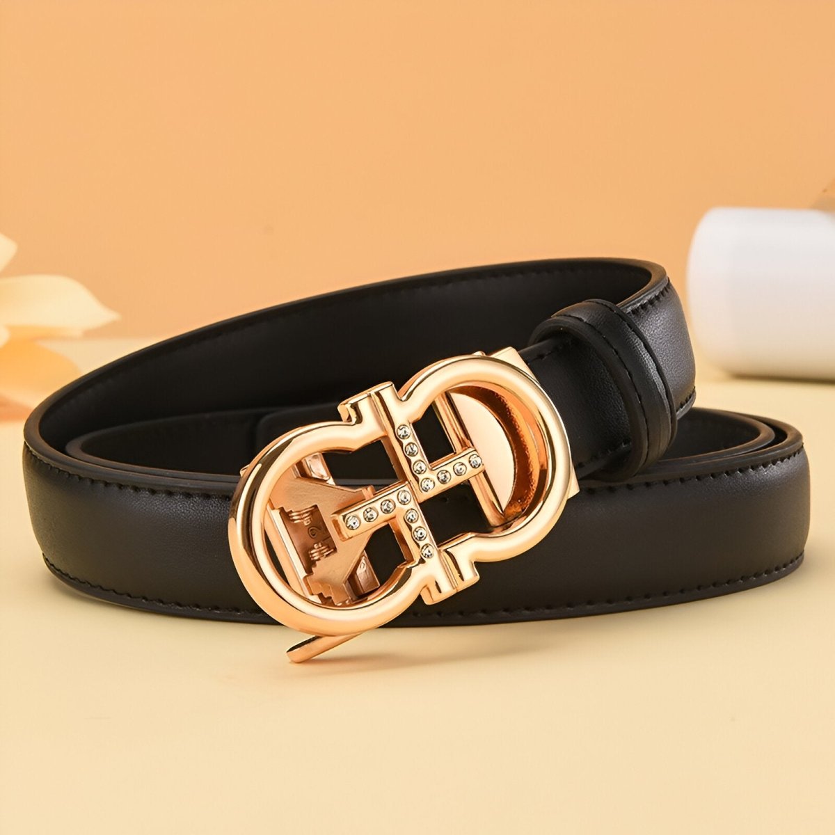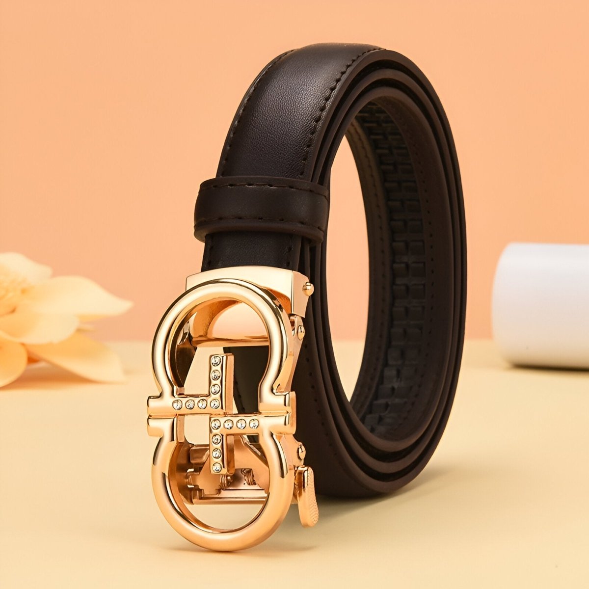 Style et fonctionnalité réunis dans la ceinture automatique en cuir à boucle dorée oméga, modèle Sandra