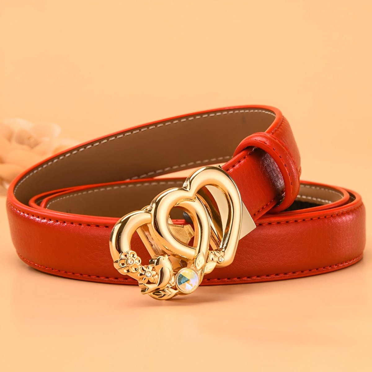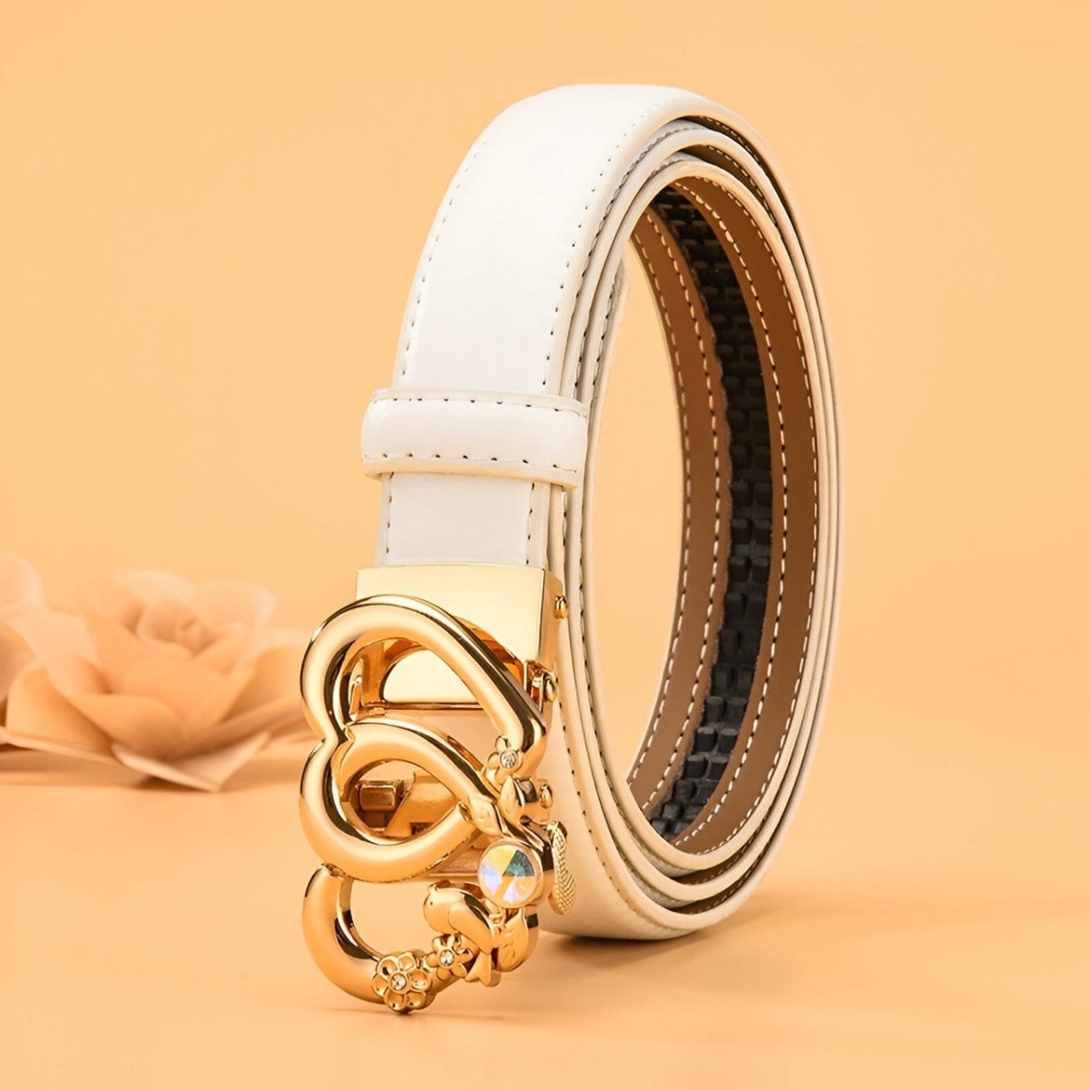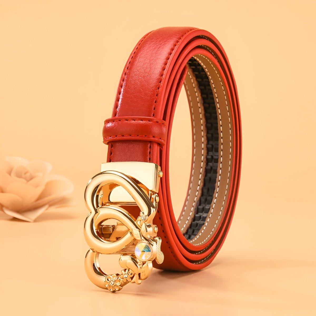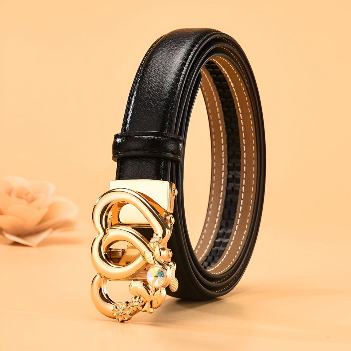 Un design exclusif avec la ceinture automatique en cuir à boucle double coeur pour femme, modèle Kiara