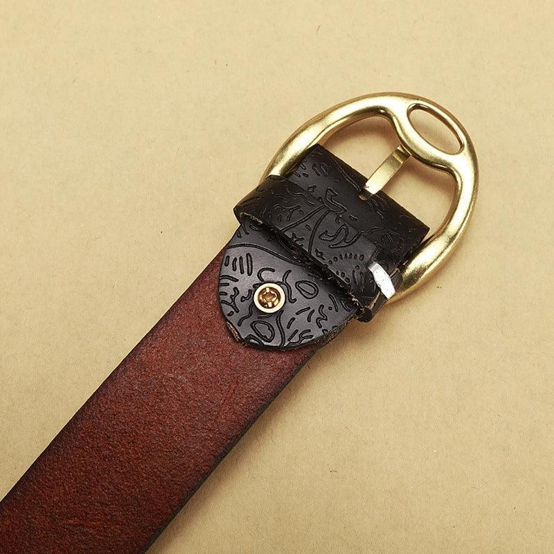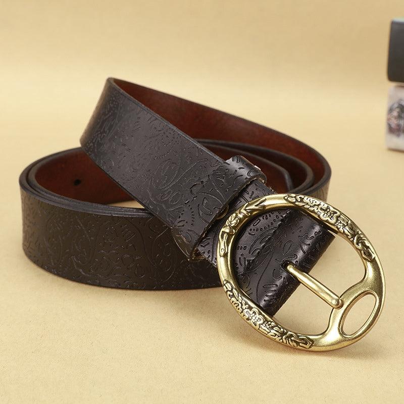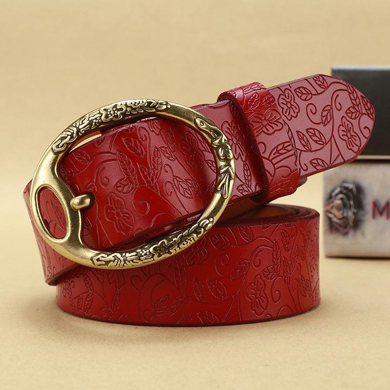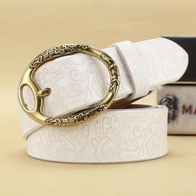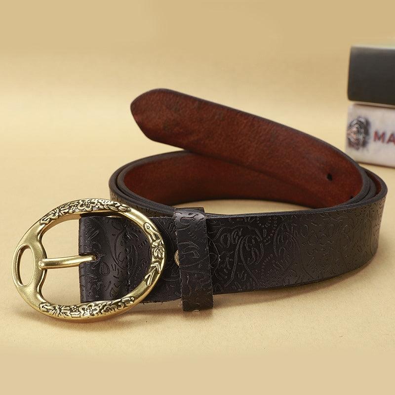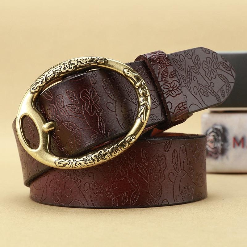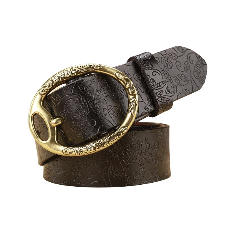 La boucle ovale en métal, ornée de motifs floraux détaillés, ajoute une touche d’élégance et de charme à ce modèle. Chaque élément de cette ceinture a été soigneusement pensé pour offrir un produit qui non seulement embellit vos tenues, mais raconte également une histoire de qualité et d’authenticité.