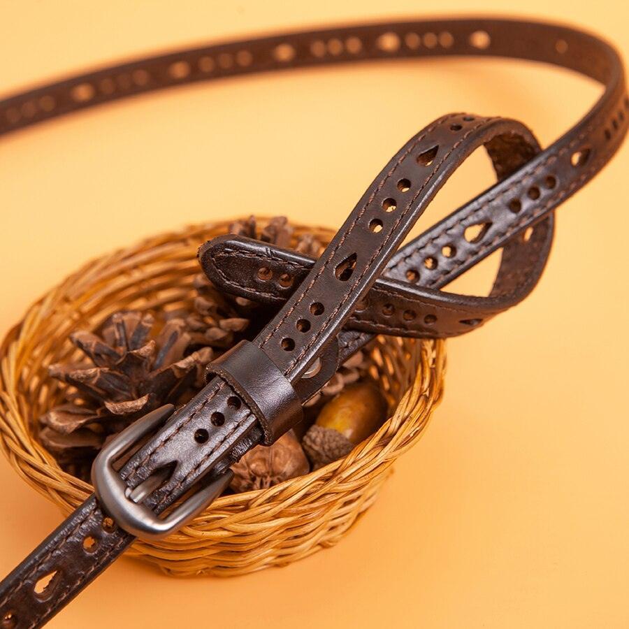 Ce modèle Anei est conçu pour celles qui souhaitent exprimer leur individualité tout en restant dans les tendances actuelles. La finesse de son design perforé en fait un accessoire unique, révélant un savoir-faire artisanal remarquable. Cette ceinture en cuir est le choix parfait pour sublimer une jupe tailleur ou un jean décontracté.