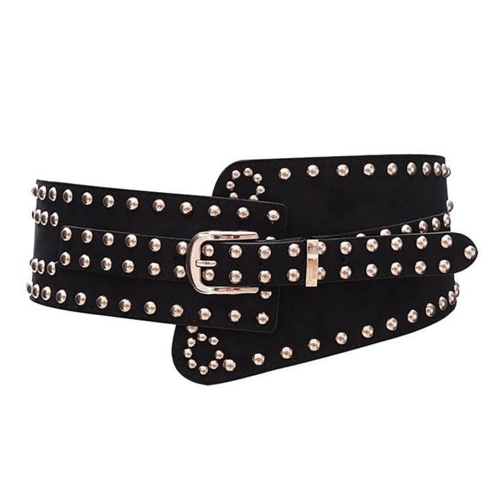 Découvrez la ceinture large élastique et cloutée, taille haute, pour femme, modèle Monika, pour un look audacieux.