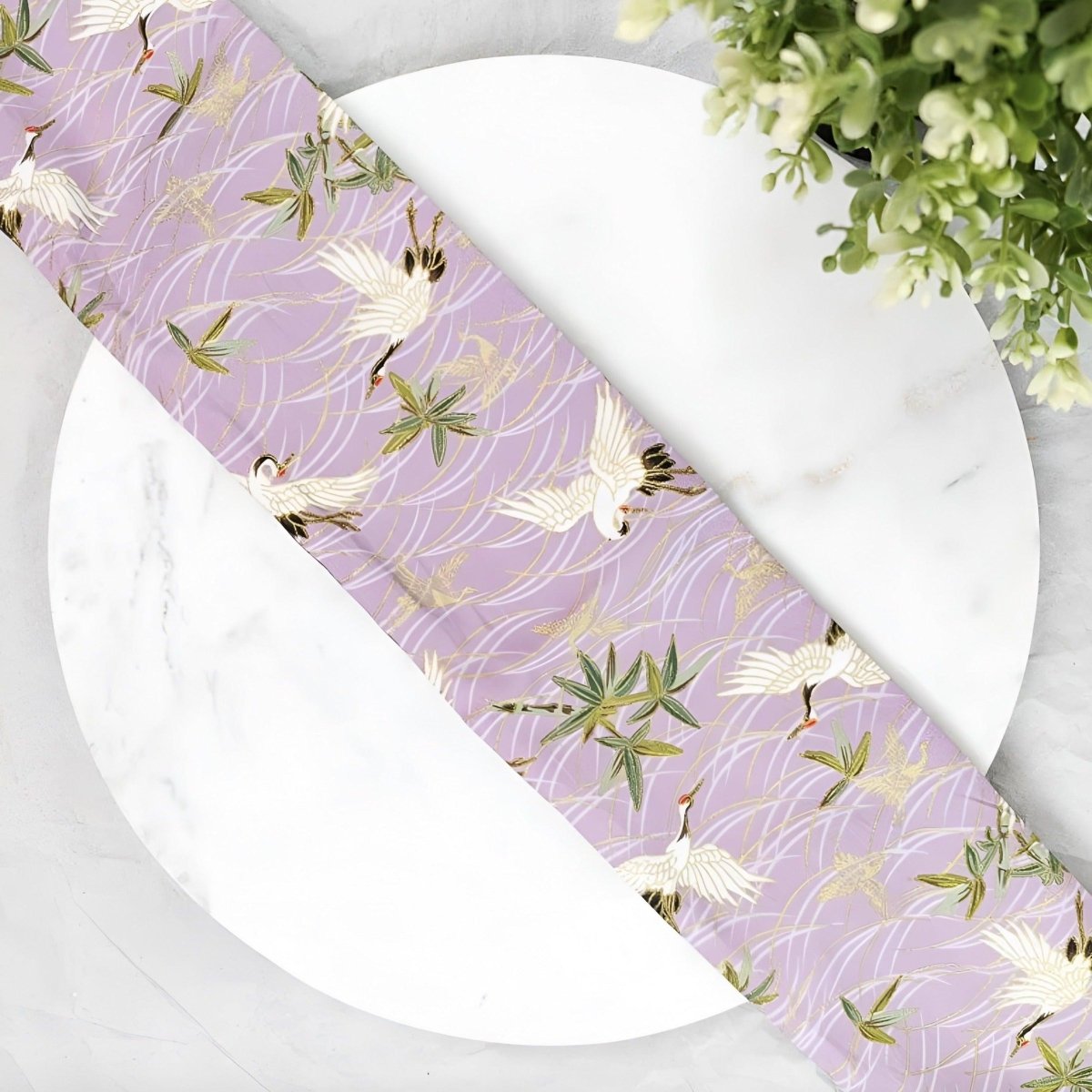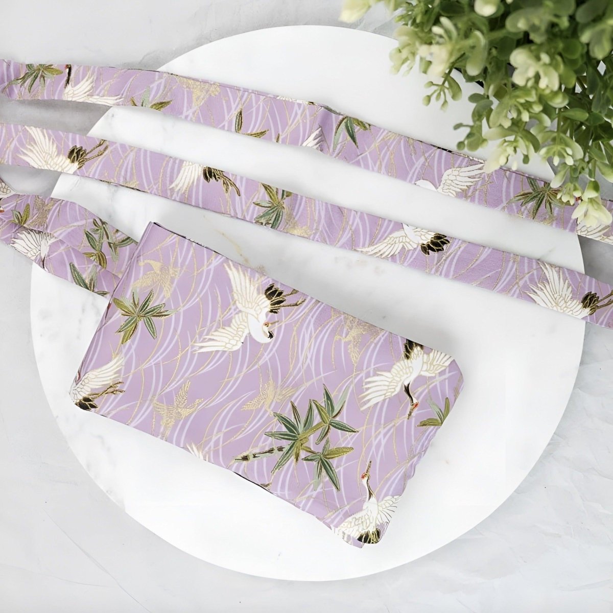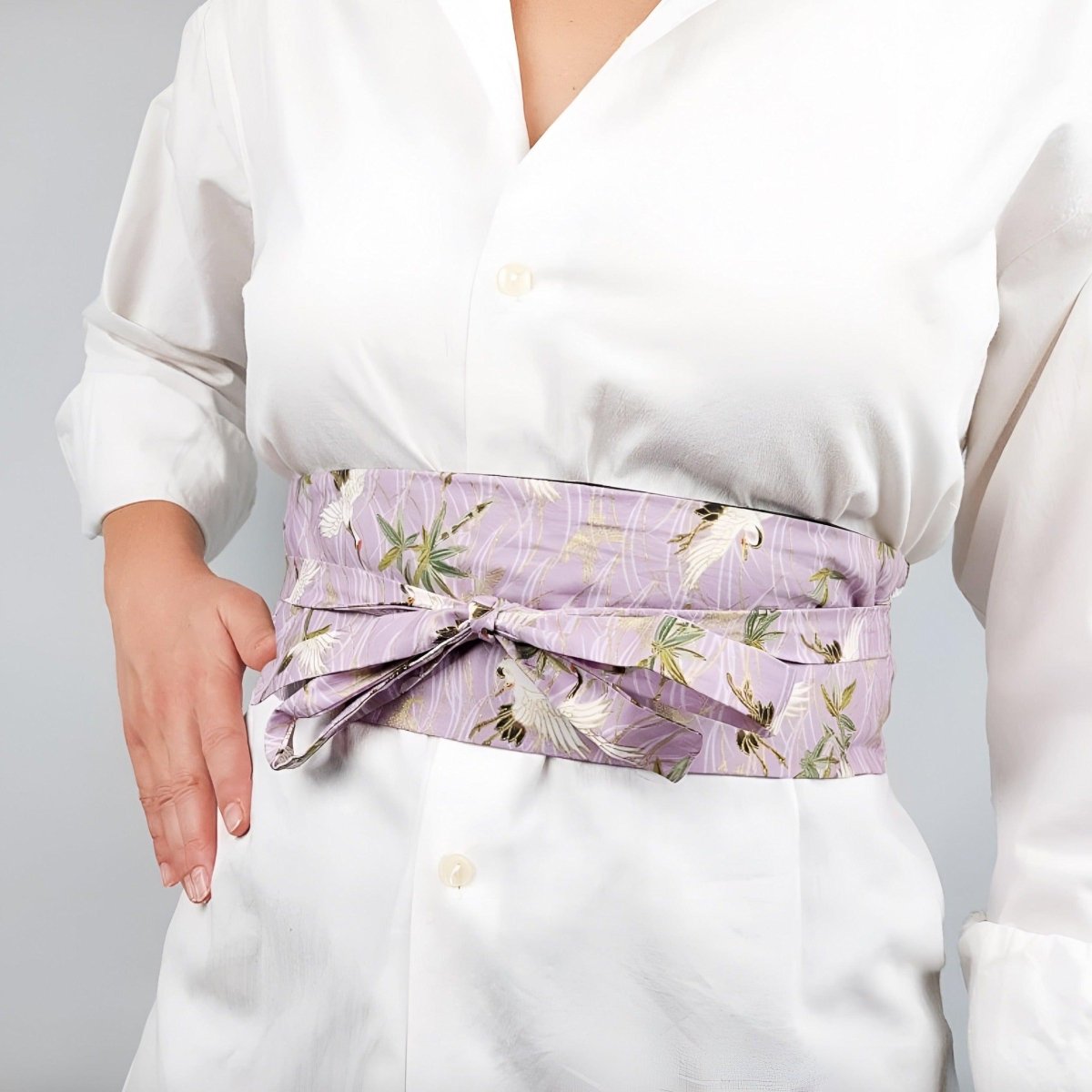 Adoptez la sérénité avec la Ceinture Obi rose à motifs grues, modèle Oshita