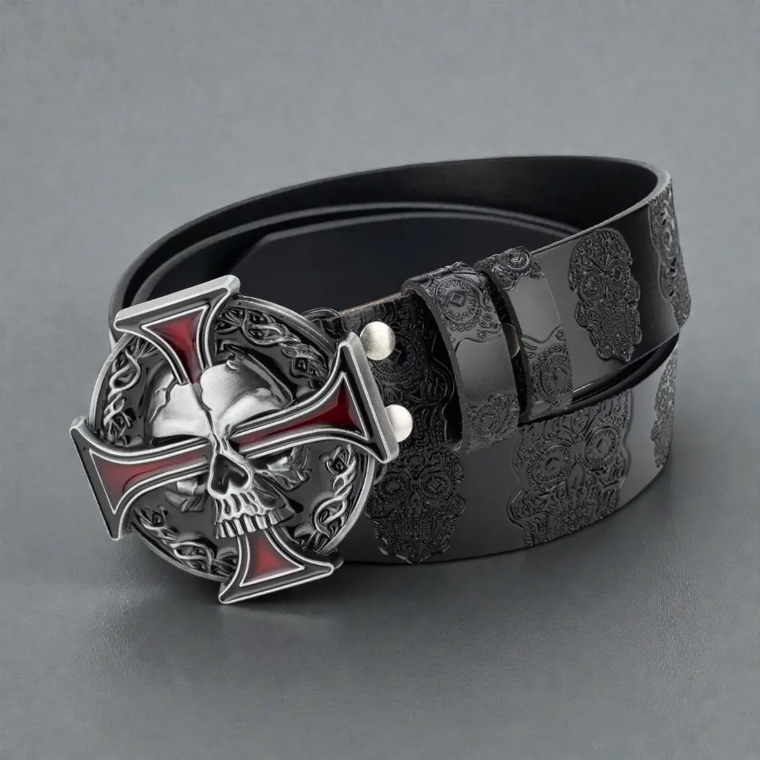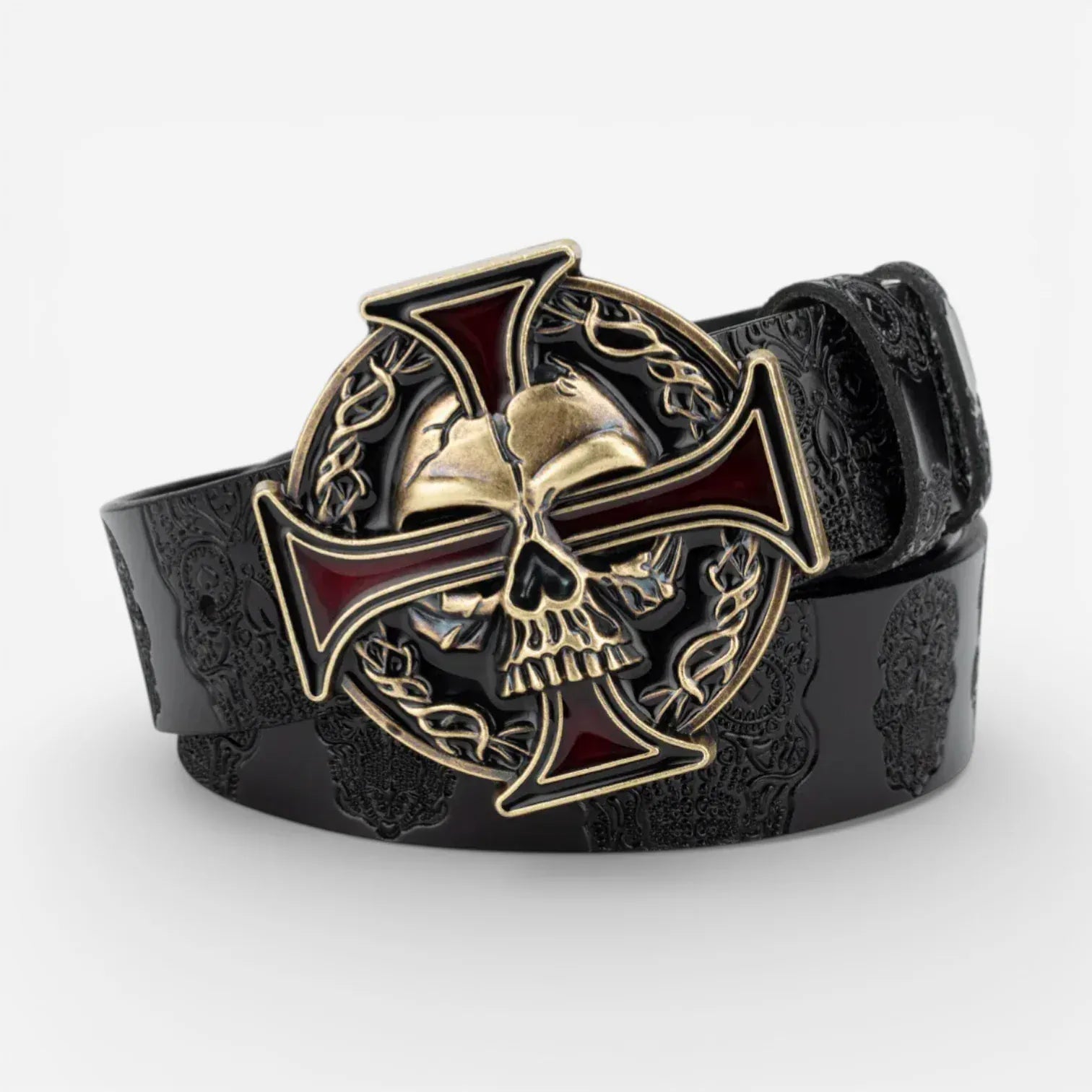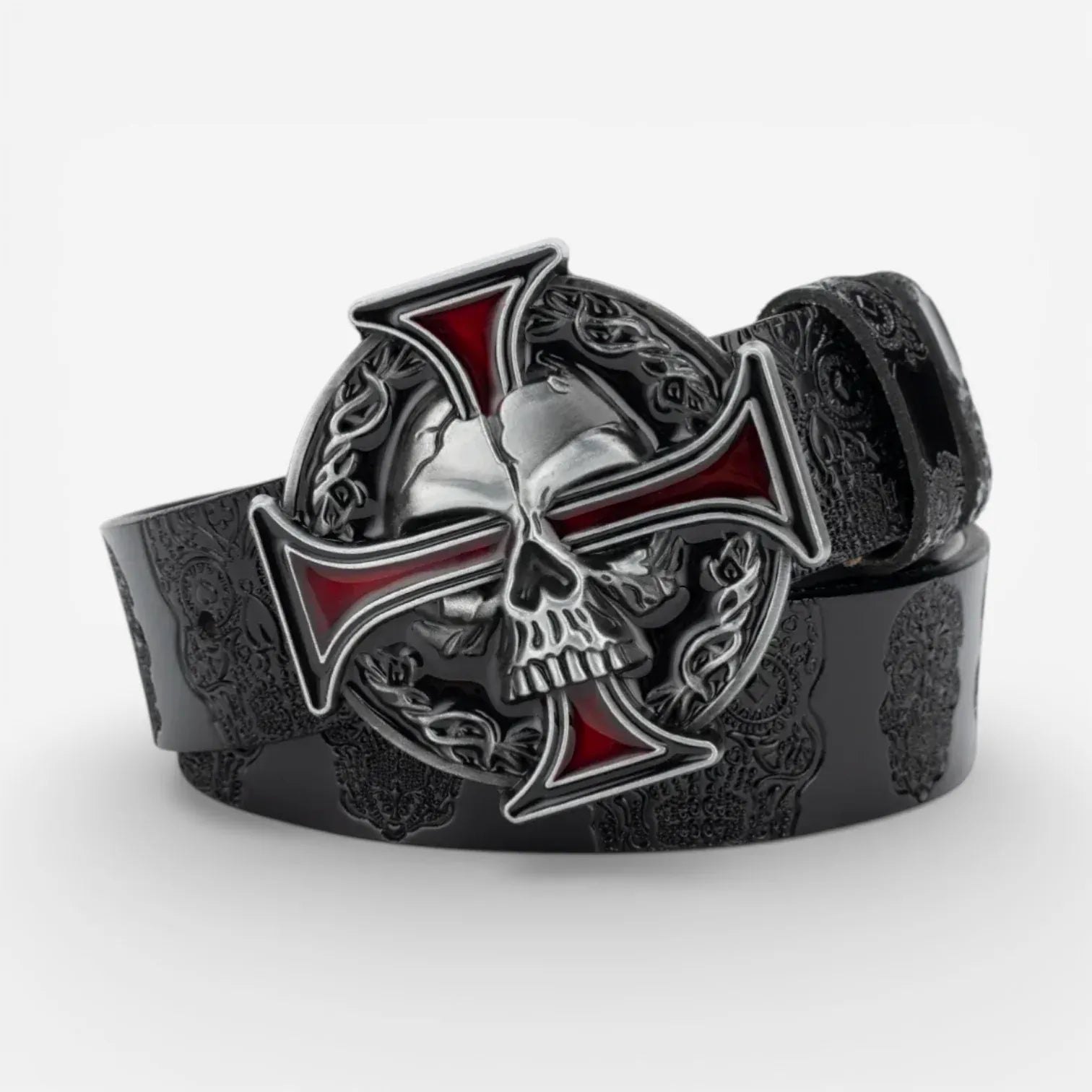 La ceinture tête de mort – Skullcross est idéale pour ceux qui recherchent un style résolument audacieux. Ce produit incarne l’alliance parfaite entre une esthétique rock et un design intrépide. Sa boucle emblématique en forme de tête de mort reflète un esprit rebelle et audacieux, affirmant clairement votre goût irrévérencieux dans tous les environnements urbains.