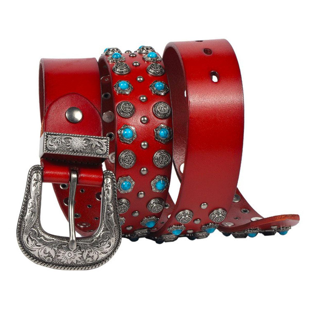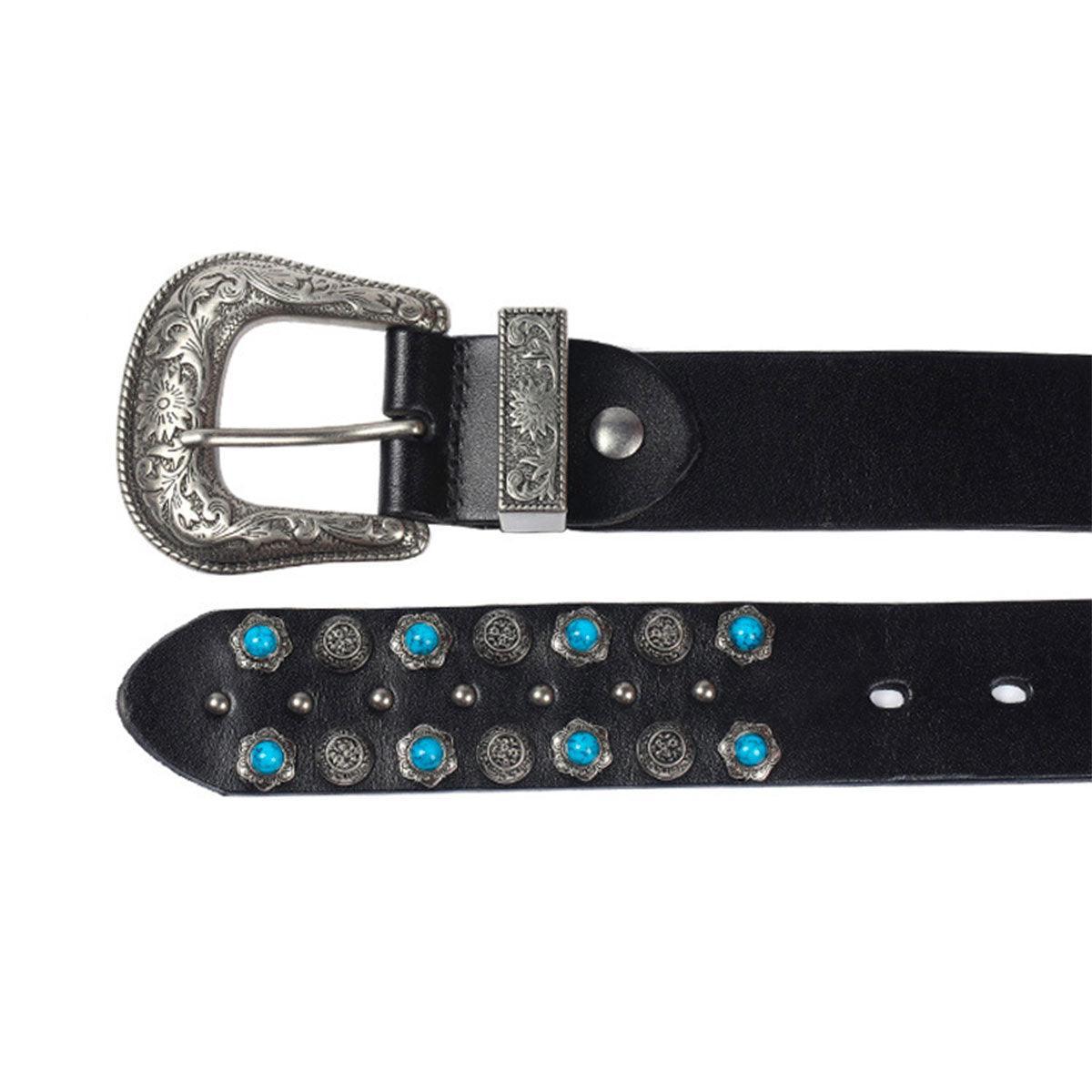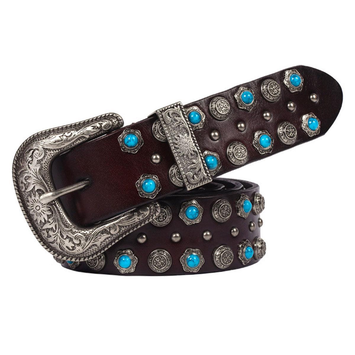 Un hommage au savoir-faire artisanal avec la Ceinture Western à Rivets et Turquoises Incrustées, modèle Freda